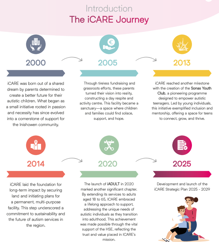 Inishowen Childrens Autism Related Education, (iCARE) Ltd exists to support autistic individuals and their families in the Inishowen area. Established in September 2000 by a small group of parents, we work to break down barriers and promote inclusion. We are committed to advocating for our members and ensuring equity of opportunity for all. In the initial years the organisation focused on support, lobbying, training and education with great success. One of the key achievements of iCARE Ltd is the establishment of the iCARE Centre located in Buncrana County Donegal in 2007 and the purchase of the land that we are based on in 2013. More recently in 2020, we established our adult service, iADULT. We are indebted to our local community for the ongoing support they give us. The community has supported us for the past 23 years and we could not continue without it.